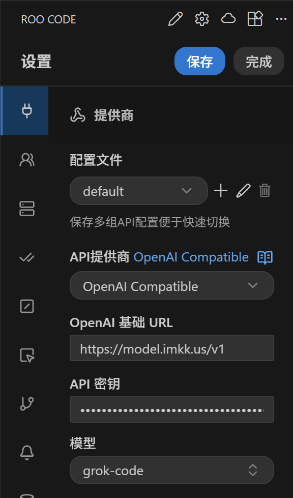 After completing the Roo Code installation, you can open Roo Code, select configure provider, and add a new OpenAI Compatible provider. The specific configuration items can be referenced: