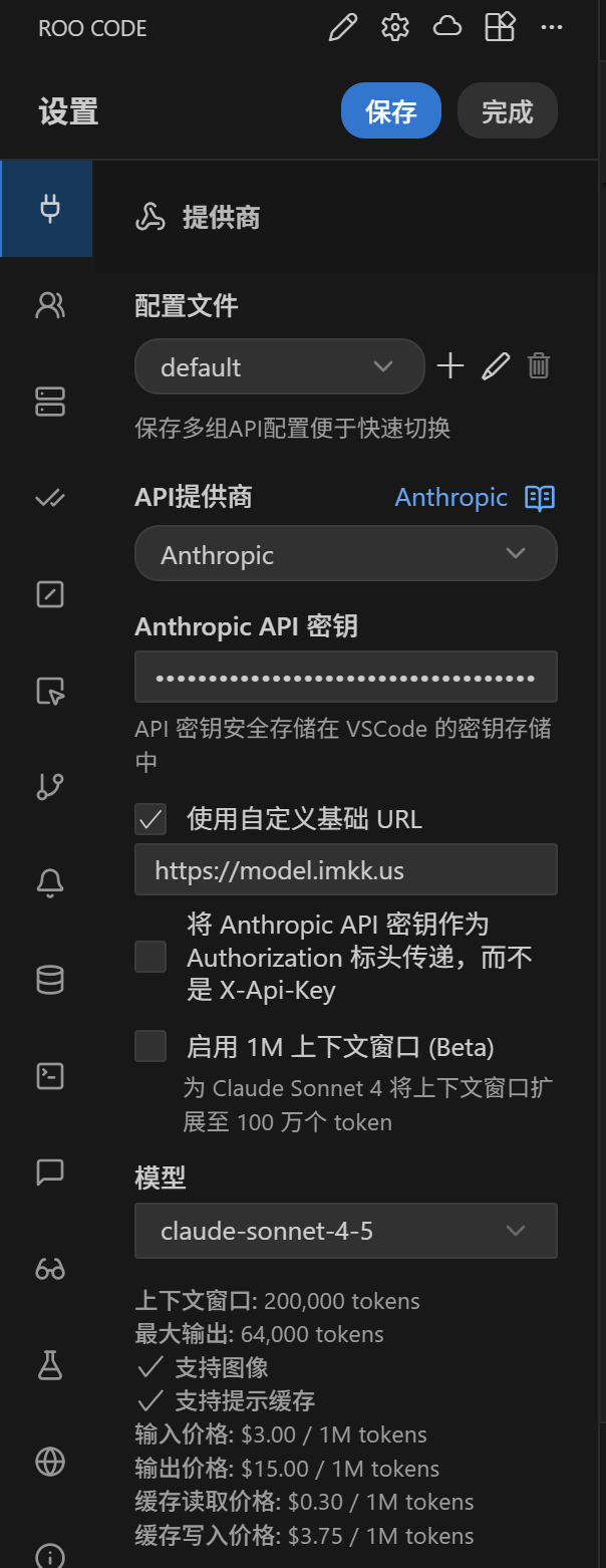 完成 Roo Code 安装后,可以打开 Roo Code,选择配置提供商,新增一个 OpenAI Compatible 的供应商,具体配置项可参考: